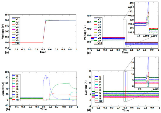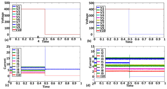 Performance of the DC microgrid: (a) without algorithm node voltage (b) without algorithm node current; (c) proposed algorithm node voltage (d) proposed algorithm node current.
