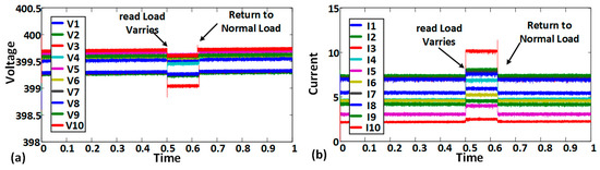 Load variation on the DC microgrid: (a) node voltage; (b) node current.