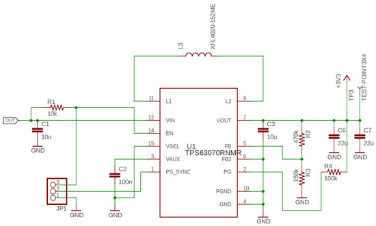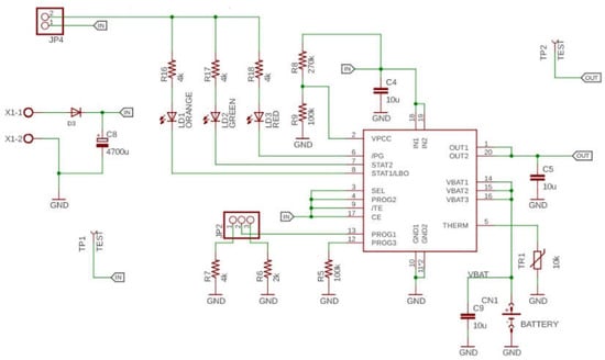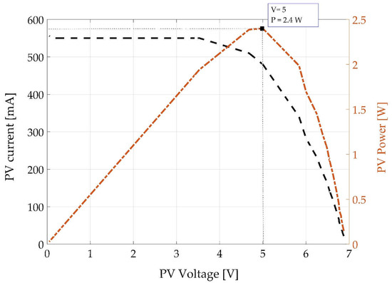 Each node is provided by a 3.7 V battery boosted to 5 V for long term operations, as shown in Figure 2. One charge is enough to ensure up to 15 days of operations since the power consumption of the node in standby is limited to 3 mA thank to the development of an optimized firmware, beyond the use of low-power components. In any case, energy harvesting techniques have been also implemented in order to provide continuous and autonomous operations without the need for continuous maintenance or wired installation that may prevent the use of the system. Each node is provided by a 5 W solar panel and the solar energy caught by the panel is used for current operations or to research battery. The power management is demanded to the controller MCP73871, from the Microchip. It is optimized for system load sharing and battery charge management and it’s also capable of power source selection between input or battery. This component allows taking advance of some important features since it is capable of simultaneously powering the system and charging the on-board battery, and implements a Voltage Proportional Current Control (VPCC) that ensures system load has priority over battery charge current. With this component a Maximum Power Point Tracking (MPPT) system has been realized since the solar panel has been characterized (Figure 3) to determine the maximum efficiency and so the recharge current provided to the panel is determined by the algorithm in order to have an almost constant voltage at the input terminals of the PV panel. In this way the system operates always in maximum efficiency conditions, and from a practical point of view allows the battery to remain approximately fully charged in normal illuminance conditions. In Figure 4 the schematic of the charger section is reported.