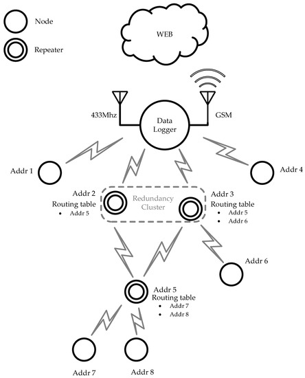 Each node is identified by a unique address, while each repeater has a routing table to determine whether a message has to be relaunched.