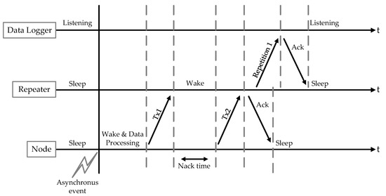 Figure 7 shows the time diagram of a typical communication between a node that senses an event, a repeater, and the data logger.