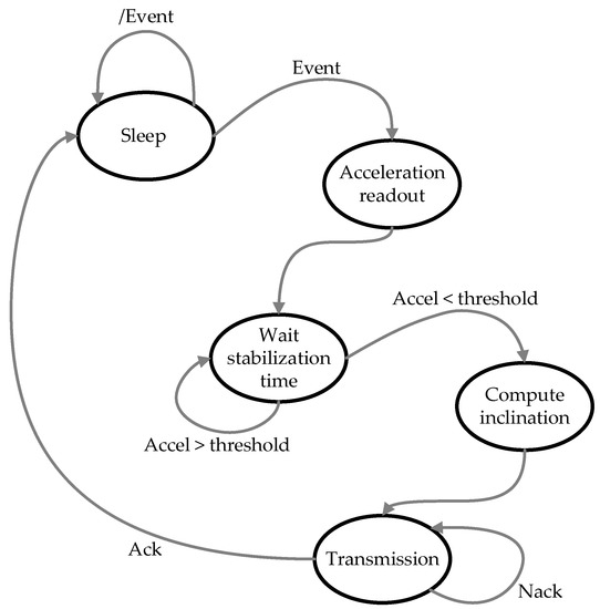 After an occurrence, the accelerometer buffer is suitably consulted, and the maximum acceleration experimented is added to the data to be sent. Since the inclination of the structure hosting the node is computed by means of static accelerations, the sensing element waits for vibrations to fade before computing the actual tilt to be added to the data packet. After this processing the packet is suitably transmitted, and the element returns to sleep mode.