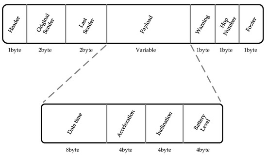 The packet structure is shown in Figure 9. The Header and the Footer are used to determine the data integrity while the Original sender and the Last sender identify the address of the first element to release the message, and the last (eventual) repeater to repeat it, respectively. They correspond to each other if the former sender transmits directly to the data logger. The Hop Number field indicates the number of times the packet is repeated. The Warning field is used by the data logger to determine the priority level of the packet.