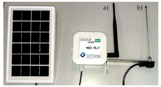 The complete sensing node prototype with the solar panel and the antenna that can be directly connected to the node (a) or placed apart from the sensing area (b).