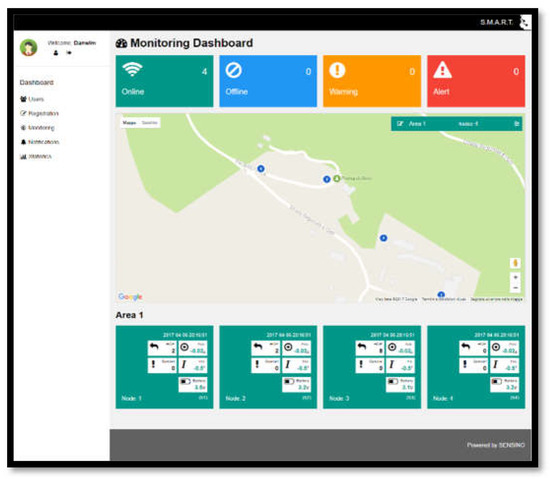 In the following, the final prototypes that have been developed and fabricated are reported. Figure 10 shows the multi-layer PCB realized for the sensing nodes (Figure 10a) together with the external plastic case (Figure 10b). Figure 11 illustrate the complete node with the auxiliary solar panel and the antennas, both integrated and auxiliary, while in Figure 12 the final prototype of the datalogger is reported. Finally, in Figure 13 a screenshot of the web interface that has been developed for remote data consulting and alerts management is shown.