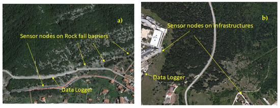 Example 1: (a) installation on rock fall barriers in the south of Italy; (b) installation on concrete buildings in the center of Italy.