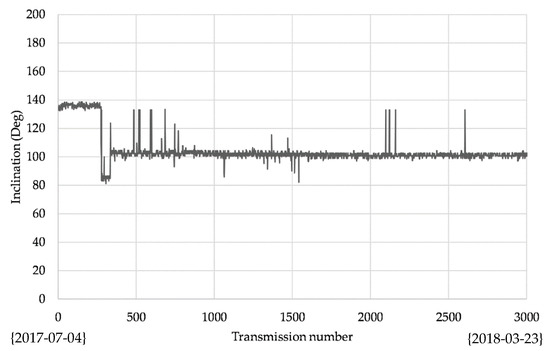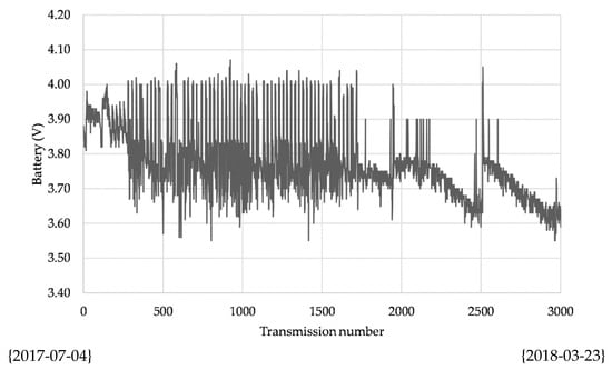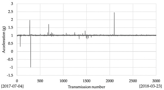 Some experimental fields are now installed in south and central Italy and applied to gabion protecting meshes, a bridge and a building. They are currently operating, and the monitoring status can be checked on a dedicated web server with remote login. In Figure 14, some examples are reported. For confidentiality, it is not possible to identify the location but, in any case, the typology of the case studies is reported in the label. From Figure 15, Figure 16 and Figure 17 some collected data are reported in order to demonstrate the feasibility of the proposed solution. The data refer to a 10 months analysis window in which the data are sampled continuously with a time step of 2 h. In particular, Figure 15 shows the acceleration of a node and the trace reveals the occurrence of some events during the considered period. Figure 16 illustrates the inclination of the node, which we can observe as the node has changed its static z-position; while Figure 17 repots the time behavior of the battery level in the considered period showing the capability to ensure a continuous autonomous functionality.