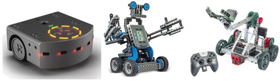 Other platforms are Thymio (Figure 2 left) [17,33,34], Meet Edison’s or VEX robots (Figure 2 middle and right), and simulated environments such as TRIK-Studio [28,35] or Robot Virtual Worlds (RVW) [36].