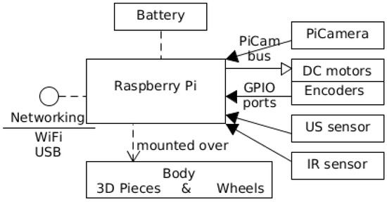 The block diagram of the PiBot hardware is shown in Figure 4. The main computer is a Raspberry Pi 3 controller board (Figure 5 middle). It is more powerful than Arduino processors, maintains low costs, and runs a functional operating system based on Linux; specifically, the Raspbian Stretch distribution. It allows the use of standard development tools on the Linux community and the use of the PiCamera.