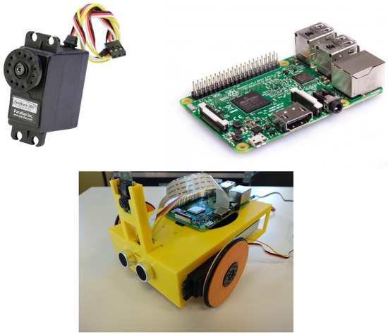 - A robotic platform, the PiBot, based on the free hardware controller board Raspberry Pi 3. This board is mounted over a chassis designed as a 3D printable model, which lets anyone, not only schools, build their own robots at a low cost, following the Do It Yourself (DIY) philosophy. The Raspberry was chosen as the PiBot processor for several reasons: firstly, the inclusion of a camera with its own data bus, the PiCamera, which allows the teaching of Artificial Vision algorithms; secondly, it maintains a low cost robotic platform but with high computational power; thirdly, the inclusion of the GPIO ports on the board, thanks to which various sensors and actuators were connected; and, finally, it is a standardized versatile board.