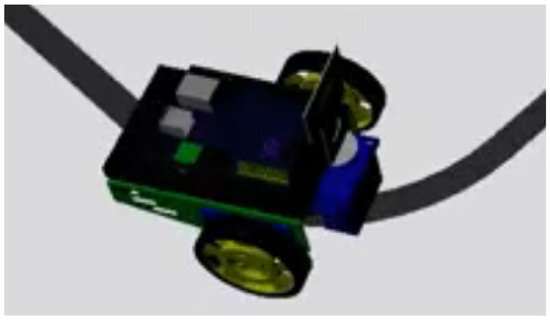 This second step consists of a complete robotics project where students combine everything they have previously learnt. Exploring the existing literature, we found a set of exercises that are frequently used in different teaching frameworks and academic proposals, in an almost cross-curricular manner. One of the classic projects is the follow-line behavior [15,21,28,35], as shown in Figure 14. In this project, the robot has IR sensors pointing to the ground, which is white but has a thick black line. Another is the avoidance of obstacles [21,35], as shown in Figure 15, where the robot has an ultrasound sensor that allows it to detect objects that interfere with its movement. The student’s program must then order the motors to stop and turn until they find a free space to go forward again.