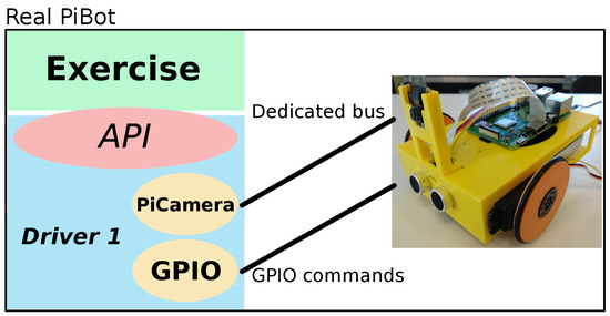 To support the real PiBot, two modules were programmed, as shown in Figure 8. One includes the management of the PiCamera and the other deals with GPIO devices (US sensor, IR sensor and motors). They were programmed in Python using standard libraries available in the Python community. It is publicly available on the web (https://github.com/JdeRobot/JdeRobot/tree/master/src/drivers/PiBot/real). The image processing functionality also relies on OpenCV.