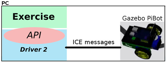To support the simulated PiBot on Gazebo, a specific library was developed, which connects with the previously mentioned plugins (Figure 9), exchanging messages through the ICE communication layer. It achieves sensor readings and camera images through network interfaces built in the JdeRobot project (https://jderobot.org). It is also publicly available on the web (https://github.com/JdeRobot/JdeRobot/tree/master/src/drivers/PiBot/Gazebo).