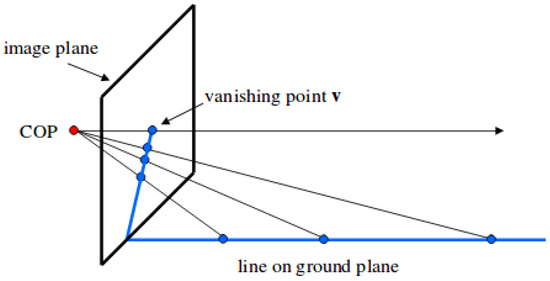 The vision library developed contains an abstract model of the camera (pin-hole) and several projective geometry algorithms. The camera parameters are known (K matrix and relative position inside the robot). As the PiBot only has a single camera, no stereo technique can be used for depth estimation. Instead, the implementation of the getDistancesFromVision() method assumes that all objects lie on the floor and the floor surface has a uniform color (ground hypothesis). It sweeps all the columns of the current image from its bottom. When the first edge pixel is found on a column, it is backprojected into 3D space, using ray tracing and the pin-hole camera model. The intersection of this ray with the floor plane is the estimated position of this edge in 3D space, and its distance to the robot is computed. In this way, the 3D point corresponding to each bottom pixel of the obstacle in the image can be obtained (Figure 11).