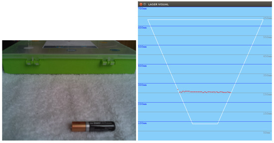 For instance, the left-hand side of Figure 12 shows the image coming from the camera, with the white floor (the battery was safely ignored as only green pixels were taken into account for explanatory purposes in this test). On the right-hand side, the estimated depths for the green object are displayed as red points and the field of view is also shown as a white trapezoid. The estimated distances are regularly consistent and correct.