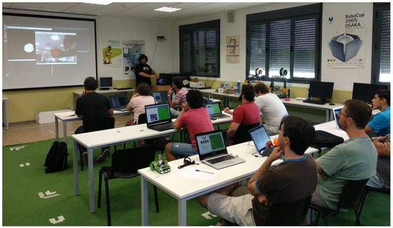 In July 2018, a Robotics workshop was taught to ten teachers at the Campus of Fuenlabrada of the Rey Juan Carlos University (Madrid) (Figure 17), training them to use the developed framework with PiBot as a robotic platform.