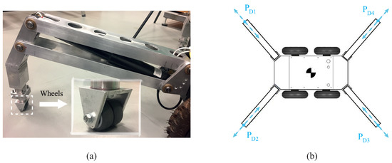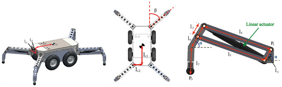 Each leg is actuated by a linear actuator which has the function of changing the configuration of the system. Figure 1c shows that modifying the extension of the linear actuator leads to an alteration in the distance between the support point of the leg, , and the point that joins the leg and the base of the truck, , changes.
