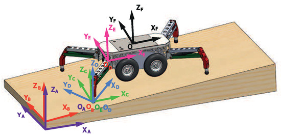 - Frame : this is an inertial frame related to the upper part of the base of the truck. Its z-axis is perpendicular to the upper part of the base of the truck. The origin of this coordinate axis is on the point of support of each leg. The orientation of this frame with respect to {A} is []. It is interesting to express the orientation of this frame with respect to {A} because the inclination measurements of the sensor that will be used in the control process are related to frame {A}. We shall define one frame for each leg.