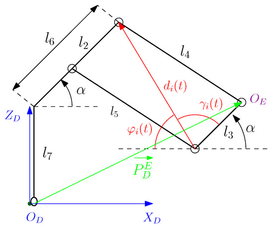 In Figure 4, , , , , and are parameters of the system (see Table 1) and they are constant. However, and depend on the length of the linear actuator, .