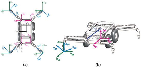 Once the kinematics of one leg has been defined, the next task is to define the frames , and of the four legs. Figure 5a shows the definition of the frames for each leg. As will be noted in this figure, the orientation of the frames and is the same for the four legs and they are located on the support point of each leg and on the point that joins each leg to the base of the truck, respectively. However, the orientation of the frames are different for each leg and they are located on the support point of each leg.