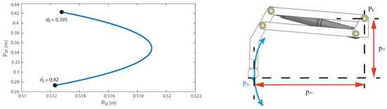 The support point of the legs has a little displacement around the plane of the ground owing to the configuration of the four-bar mechanism used to move the legs of the system. Figure 6 depicts the relative movement of the support point and (blue line) when the extension of the linear actuators varies considering that the point is fixed thorough the movement (actually, is not fixed, but we do it in order to illustrate the relative movement between and ). Notice that this movement is not only vertical; the support point also follows a semicircular path. The configuration of the legs will, therefore, cause movements of the support point, , in the direction x of the frames . This phenomenon was observed with the real prototype, and as the absolute displacement of and depends on the configuration of the system, we only know the relative displacement between these two points.