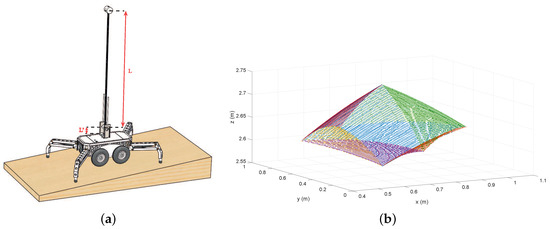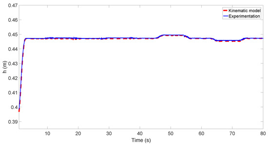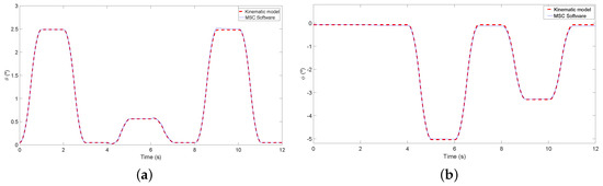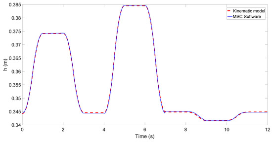 Figure 8 and Figure 9 show the results obtained doing co-simulations with Matlab/Simulink and MSC ADAMS software and the results obtained using the proposed kinematic model (the orientation is obtained solving the Equations (10) and (11) using the parameters of Table 1, the orientation of the ground and the positions of the actuators and the height of the centre of frame {F} are obtained using (12)). This software has been used to simulate the kinematics of the system combining different positions of the linear actuator in order to asses the accuracy of the proposed kinematic model. During simulations, the system was placed on an inclined plane and a combined movement of the linear actuator was proposed. The plane on which the system is located has an orientation of and . In the initial configuration of the system, its four legs are touching the ground and the base of the system has an orientation of and . A trajectory that modifies the inclination in both directions is generated using the linear actuators in order to validate the kinematic model. The system was located in an inclined plane in order to demonstrate that the proposed kinematic model is valid for any inclination of the ground. Figure 8 shows the height of the center of frame {F} and Figure 9a,b show the pitch and roll angles of the system, respectively