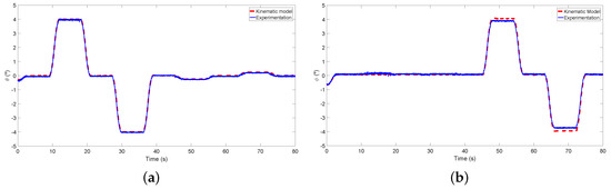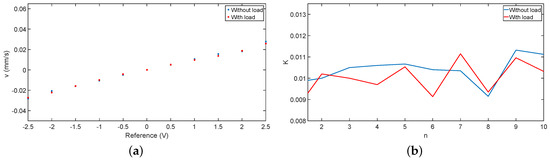 Note that Equation (16) tends toward Equation (17) if is much higher than 1. Figure 15a shows the relation between the control signal and the velocity of the system in both cases. Figure 15b depicts the constant K of the transfer function (17) for each step and for both experiments.