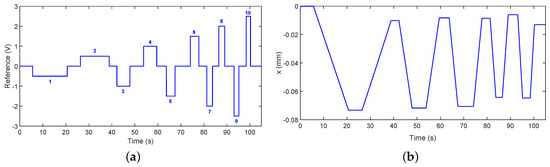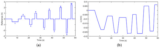 The identification process of the dynamics of the linear actuators was carried out for two different cases: (a) when the leg is not in contact with the ground and the system does not, therefore, have to move a load and (b) when the system is in contact with the ground and the load on the mobile platform (the total mass of the system is 50 Kg) is distributed over the four legs. In each case, ten steps with different amplitudes were used as input to the system. In Figure 13a,b, the applied voltage of the system and the extension of the linear actuator are shown, respectively, for case (a). In Figure 14a,b, the applied voltage of the system and the position of the linear actuator are shown, respectively, for case (b). These figures show that the response of the system to the steps are ramps with different slopes. It is, therefore, possible to conclude that the transfer function that relates the control signal (V) and the linear position of the actuator (x) can, for both cases, be approximated using the expression: