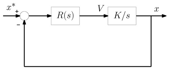 where is the motor torque that is assumed to be proportional to the control voltage signal V, is the constant that relates the motor torques with the control voltages, and are the equivalent inertia and the viscous friction of the system, is the Coulomb friction of the motor and x is the linear position of the system. The transfer function of the system when considering the Coulomb Friction as a disturbance that will be canceled for the controller can, therefore, be expressed as: