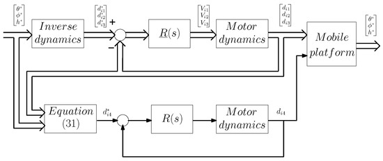 Equation (31), therefore, makes it possible to calculate the position of the linear actuator of the passive leg at each moment according to the position of the extension of the linear actuators and the orientation. Finally, the general control strategy proposed in this work is depicted in Figure 18.