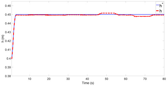 Figure 20 and Figure 21 show the results obtained after using the control proposed in this work. It is possible to obtain a very good tracking of the three variables that we wish to control (, and h). A camera-based optical tracking system was used as an external sensor. A small error owing to the uncertainties in the kinematic model will also be noted. Figure 22a shows the extension of the actuators required to carry out the desired tracking of the posture and orientation of the system. The poles of the controller of the linear actuators were located in for the four linear actuators, and the following controller for the four linear actuators was obtained from Equation (21):