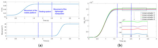 As was mentioned in Section 3.1, the wheels of the four legs are in opposing directions in order to avoid the slipping of the whole system. However, if the mobile manipulator placed above the mobile platform moves fast enough, it is possible that the reaction forces in the platform become bigger than the friction forces of the support points of the legs. Then, some slipping could appear in the mobile platform. For that reason, a simulation study of fast trajectories of the lightweight manipulator has been carried out in order to study this phenomenon. Anyway, the interaction between the manipulator and the mobile platform will be addressed in future works. For that reason, this phenomenon only is studied with some simulations. Figure 23 shows the results of co-simulations with Matlab/Simulink and MSC ADAMS software in order to compare the slipping that appears in the cases: (1) the linear actuators of the system are moving while the lightweight manipulator is stopped and (2) the lightweight manipulator is carrying out a fast trajectory ( in 1 s) while the linear actuators are braked. The initial position of the flexible manipulator is perpendicular to the plane of the mobile platform. During the first part of the movement, the linear actuators are moving in order to increase the height of the center of mass of the mobile platform, h, while keeping constant the orientation of the system ( and ). During the second part of the movement, the linear actuators are braked and the manipulator carries out a fast trajectory. In the upper part of Figure 23a, the trajectory of the height of the system, h, is shown, whereas, in the lower part of Figure 23a, the angular movement of the lightweight manipulator is shown. In Figure 23b, the module of the displacement of the support points of the legs in the plane of the ground, , is shown for each linear actuator. In that simulation, real parameters of the system have been used. The total mass of the mobile platform is approximately 50 Kg, whereas the mass of the lightweight manipulator with the camera at the tip is 1 Kg. The results show that the slipping that appears when the manipulator is moving is negligible (lower than 0.01 mm in each leg) because the configuration of the four legs does not allow it if the linear actuators are stopped. However, when the linear actuators are moving, the effect of the slipping is noticeable (around 3 mm in each leg). Notice that the weight of the manipulator is much lower than the weight of the mobile base. This is another advantage of using lightweight manipulators in mobile platforms: the reaction forces due to fast movements of the manipulator will have little influence in bulky platforms. Our mobile platform is not very big, but it has the possibility to extend its legs in order to increase the polygon support of the system and improve considerably the physical stability of the system. The interaction between the manipulator and the base platform has been only addressed analyzing the slippage caused by a fast movement of the manipulator. Only simulated results have been provided because it is not easy to precisely measure the produced small slippage. We have not noticed any vibrations caused by the possible manipulator-non rigid platform interaction, as the experimental measures given by the external optical system show in Figure 20 and Figure 21. Then, we can state that our platform is quite rigid.