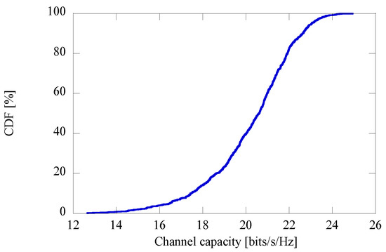is transmission power, is noise power, is the number of transmitter elements; their values were = 10 dBm, dBm, in this experiment. H and I represent the MIMO channel matrix and identity matrix, respectively. Since the propagation channel, H, is not normalized, H includes propagation loss. Varactor diodes were set between all repeater elements. As each passive repeater array had 16 dipole elements, 32 varactor diodes were used, . Channel data were obtained by controlling all 32 varactor diodes. Propagation channel H was measured for 55,080 randomly determined combinations of reactance values. The maximum channel capacity was calculated for all measured channels using (5). As additional information, (3) was derived by [17], and (5) by [18]. The defined channel vector is expressed as