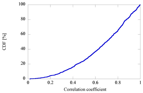 therefore, (4) is the inner product between and . When and are orthogonal vectors, the spatial correlation coefficient becomes 0.