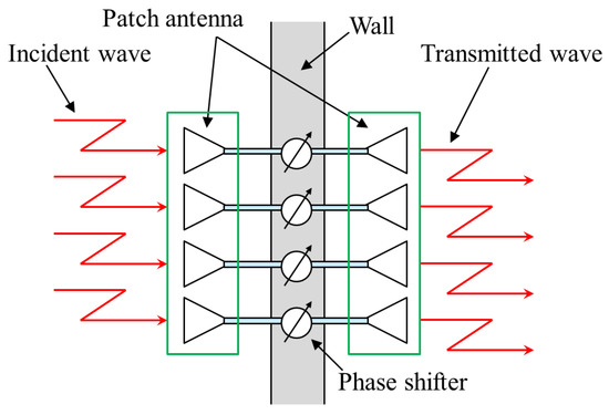 Figure 3 shows the basic mechanism of our tunable passive repeater. There are two spaces separated by a solid wall that blocks all signals. The two array antennas of the relay are connected by coaxial cables that pass through the wall. Between their reception and re-transmission, the phases of the signals are altered by the phase shifters. Since the passive repeater uses array antennas, this is equivalent to controlling the propagation direction. Therefore, it is expected that the tunable passive repeater can improve SNR and decrease the spatial correlation coefficient.