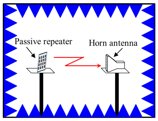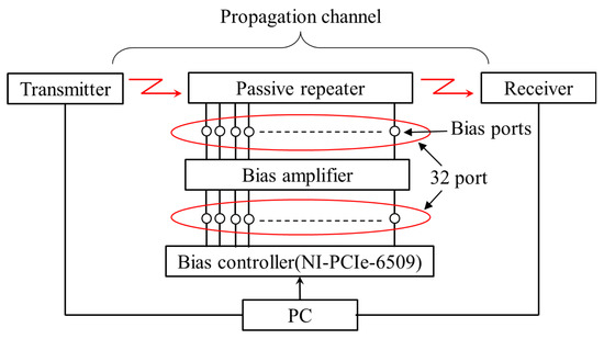 Figure 4a shows a photo of a fabricated tunable passive repeater. It consists of rectangular patch antennas printed on a polytetrafluoroethylene (PTFE) substrate. The substrate’s relative permittivity and loss tangent are and tan, respectively. The substrate is 250 × 300 mm, 1.60 mm thick. The backside of the substrate is fully covered by the ground conductor. Inter-element spacing of the patch antennas is set to 0.5 ( : wavelength in vacuum). The number of elements is . The circles on the passive repeater in Figure 4a indicate bias port and varactor diode (HVU316: Renesas Technology). Figure 4b shows a cross-section of the proposed configuration to explain the structure. The passive repeater is a back to back array antenna as shown in Figure 4a; its RF ports are connected by coaxial cables. Changing the DC bias voltage shifts the output signal phase, since the DC bias controls the reactance value of the varactor diodes attached to the patch antennas, and this changes the resonance frequency. As shown in Figure 4b, each patch antenna is loaded with a varactor diode and has an independent bias port. The bias port is placed at the center of the patch antenna, so no RF signal flows in. Moreover, inserting a DC block into the coaxial feeder cable permits each patch antenna to be controlled independently. In this way, the phase of the signal incident on each patch can be independently controlled; this offers high flexibility in altering channel characteristics since the number of the combinations of the relayed phase is quite great.