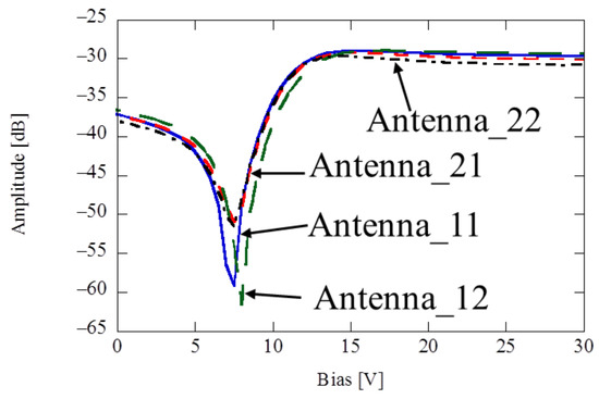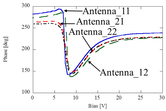 Figure 6 plots the relationship between amplitude and bias voltage. Figure 7 shows the relationship between phase and bias voltage. These data can be obtained when the horn antenna receives the signal from passive repeater. Curves Antenna11∼Antenna22, correspond to the antennas shown in Figure 4a.