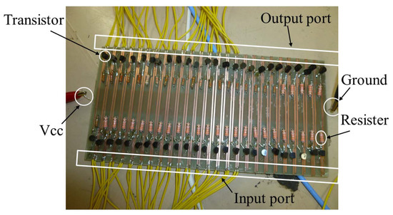 Figure 8 shows the experimental system used in this study. The propagation channel between transmitter and receiver, which is controlled by the passive repeater, was acquired by a PC. NI-PCIe-6509 (96-channel digital I/O board, National Instruments) was used as the multiple bias-voltage controlling unit. The output voltage of NI PCIe-6509 is 0 V or 5 V, and this is too low to control the varactor diodes since the voltage range required is 11∼25 V. In order to obtain sufficiently high voltages, a bias amplifier was used. Figure 9 shows a photo of the bias signal amplifying circuit consisting of transistors (2SC1815-Y) and 33 K resistors. This circuit converts the input voltages of 0 and 5 volts to the desirable output voltages of 11 and 25 volts.
