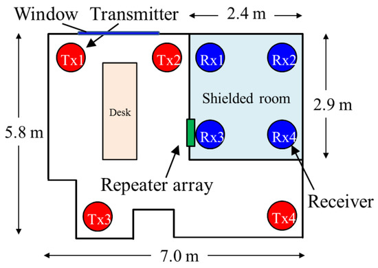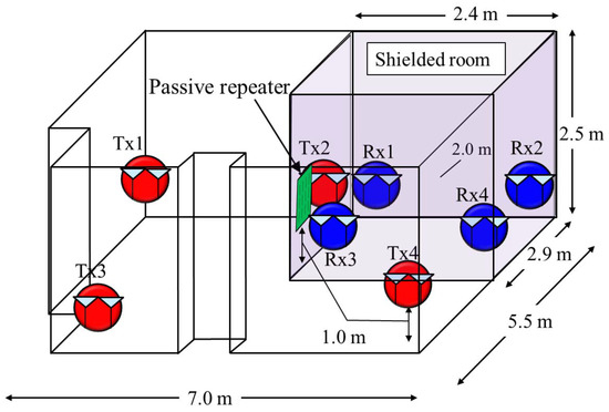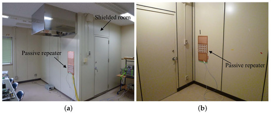 Figure 10 shows a top view of the experimental environment. Figure 11 shows an elevation view of experiment room. The size of the room was 7.0 × 5.8 × 2.7 m. Wall material was concrete. This room has windows and a shielded room. The shielded room, 2.4 × 2.9 × 2.7 m, has walls of steel. The transmitter is placed at Tx1, Tx2, Tx3, or Tx4, and the receiver is placed at Rx1, Rx2, Rx3, or Rx4. This environment has no propagation paths between transmitter and receiver other than those through the passive repeater. The shortest separation from the dividing wall to Tx1–Tx4 and Rx1–Rx4 was 0.5 m. Antenna height was set to 1.0 m. The passive repeater arrays were placed on opposite surfaces of one wall of the shielded room. Passive repeater center height above the floor was 1.0 m. Figure 12a shows an outline of the shielded room, Figure 12b shows an inside view of the shielded room. From Figure 12, it can be seen that passive repeater is in close contact with both inside-outside surfaces of the shielded room.