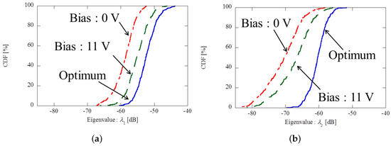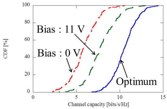 The results (a) and (b) in Figure 13 show the CDF of the first and second eigenvalues of propagation the channels, respectively. Biases 0 V and 11 V indicate the eigenvalues when the voltage of 0 V or 11 V applied to all varactor diodes, respectively. “Optimum” shown in Figure 13 indicates the eigenvalue at the maximum channel capacity as obtained by the random search method. An evaluation of the median value showed that bias of 11 V improved the first eigenvalue by 3.34 dB, and the second eigenvalue by 3.78 dB compared with bias of 0 V. Moreover, it can be seen that the result of the random search method improved the first eigenvalue by 2.76 dB, and the second eigenvalue by 6.12 dB compared with bias of 11 V. The second eigenvalue is greatly enhanced by the tunable passive repeater. From these comparison results, optimizing the impedance of the relay and its phase control offers significant improvements in eigenvalue distribution. This means that apply the tunable passive repeater to MIMO systems can increase the transmission rates by spatial multiplexing.