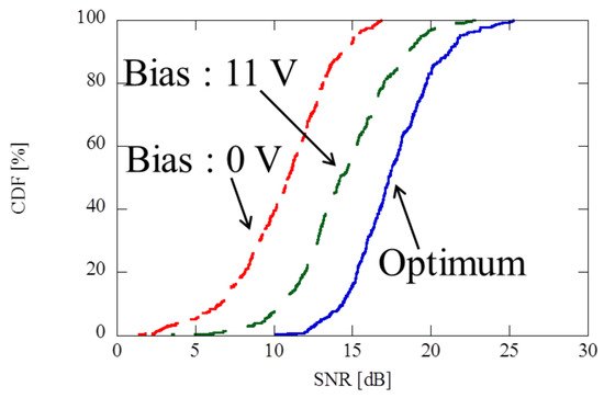 Figure 14 plots the CDF of the SNR for three different cases. With 11 V bias, the 50% value of SNR is higher by 3.29 dB than that with 0 V bias, and the 10% value of SNR is higher by 3.95 dB than that with 0 V bias. With the “Optimum” setting, the 50% value shows an improvement in SNR of 3.08 dB compared to 11 V bias, and the 10% value improved it by 3.82 dB compared to 11 V bias. These results demonstrate that the passive repeater greatly improves the SNR in low reception sensitivity environments.