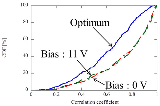 Figure 15 plots the CDF of the correlation coefficient for three different cases. It can be seen that 0 V bias and 11 V bias offer almost identical correlation coefficient distributions. This demonstrates that the radiation intensity of the patch antennas has no effect on the correlation characteristics. The 50% value of the correlation coefficient with “Optimum” is lower by 0.16 than that with 11 V bias. On the other hand, the 90% value with “Optimum” decreases the correlation coefficient by 0.03 from 0.97. This means that tunable passive repeater offers practical improvements in MIMO system performance.