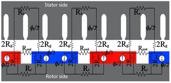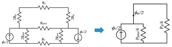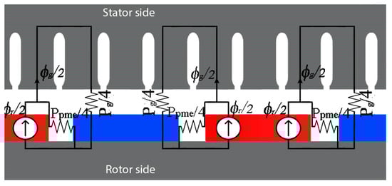 Since air gap permeability μ0 is much lower than iron permeability, the air gap reluctance is much higher than the rotor and stator back iron reluctances. Due to this, the rotor and stator reluctances can be neglected to have an easier solution. Thus, the MAGEC can be simplified, as in Figure 4. In the end, the permeance values are taken into account instead of the reluctances.