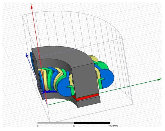 The developed MAGEC is shown in Figure 3, which is designed by minding the flux path illustrated in Figure 2a,b. The two permanent magnet halves, rotor and stator back iron, air gap, and the gap between poles are included in the MAGEC.