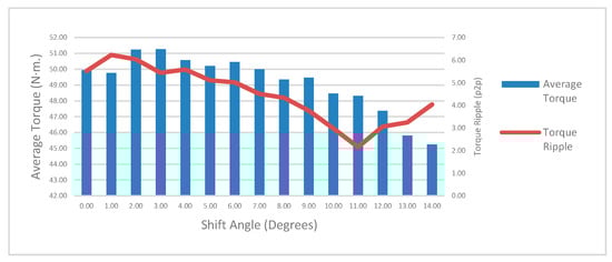 The shifting angle is defined as a variable and differs from 0° to 14° by 1° steps. The third magnet design is used to perform this analysis. The average torque and the torque ripple values are taken into account for each result in order to mitigate the total torque ripples. Figure 8 demonstrates the results of the parametric analysis. Table 3 shows each peak-to-peak torque ripple and the average torque value for each shifting angle.