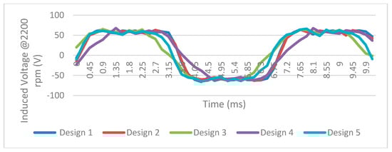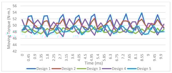 In the 3D-FEA analysis, PMs have an 11° shifting angle in designs III and IV due to the seeking of the lowest torque ripple. Torque and back EMF waveforms are taken from the dynamic simulations. Figure 9 illustrates the electromagnetic torque results of the five designs that are shown in Figure 6. As seen from the torque results, the lowest torque ripple is in the third design, with 62.4% mitigation, despite a 4.3% reduction on the average torque compared to the design I. The table of the comparison is demonstrated in Table 4. Although it has step and shift on the magnets, design IV has some of the worst data in the view of the torque ripple in this study. This is because of the magnet edges. Since some arrays are sinusoidal, some arrays are sharp. Thus, magnetic flux distribution is unsteady. Additionally, design V has a 43.2% reduction in torque ripple with a 0.8722 magnet fill factor (pole-arc ratio), as validated by Aydin and Gulec, although with some different characteristics of the simulated motors, like magnet thickness, air gap, and the dimensions in [23]. As seen from the simulations, the skewing process has a lower reduction effect than the stepping and shifting process effect on the torque ripple, as demonstrated in Table 4.