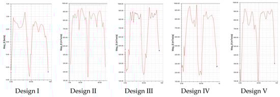 Back EMF depends directly on the speed, number of turns, pole numbers, inner and outer radii, and the magnetic flux density, as given in the Equation (13). All of these parameters are stationary without the magnetic flux density in this study. Magnetic flux density depends on the permanent magnet magnetic flux. The average values of the parameters are given in Table 5. Analytical results are obtained by calculating the MAGEC Equations (12), (13), and (16) developed earlier. The constant values are given in Table 6. Figure 10 illustrates the back electromotive force waveforms of each design. The smoothness of these waveforms is crucial to have more constant torque. That means lower torque ripple. Hence, design III has smoother back EMF and lower torque ripple waveforms.