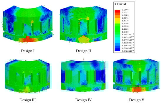After defining the shifting angle of the third and fourth designs, the magnetic simulations are completed for each design in both static and dynamic conditions. The stator was split into four identical parts and one of them was investigated due to the symmetrical geometry to reduce the simulation time.