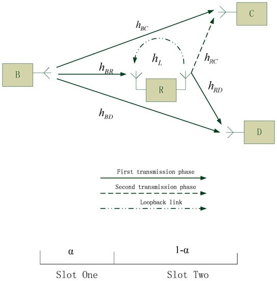 It is assumed that the channel gain of all links can be estimated accurately, and we use the Shannon’s formula to quantify the achievable transmission rates. Then, the achievable transmission rate for the cellular user in the second phase can be calculated as: