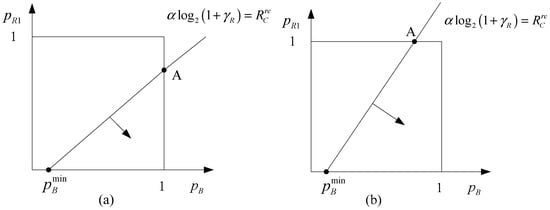 Next, we will resolve the residual parameters of the system. As we can see from the objective function, the constraint of can be modified as , namely, . It can be seen that the bottleneck of this constraint depends on the transmission in the first phase. As we described before, the relay node and base station cause mutual interference in the first phase. To get the optimal power pair , we consider the following lemma: